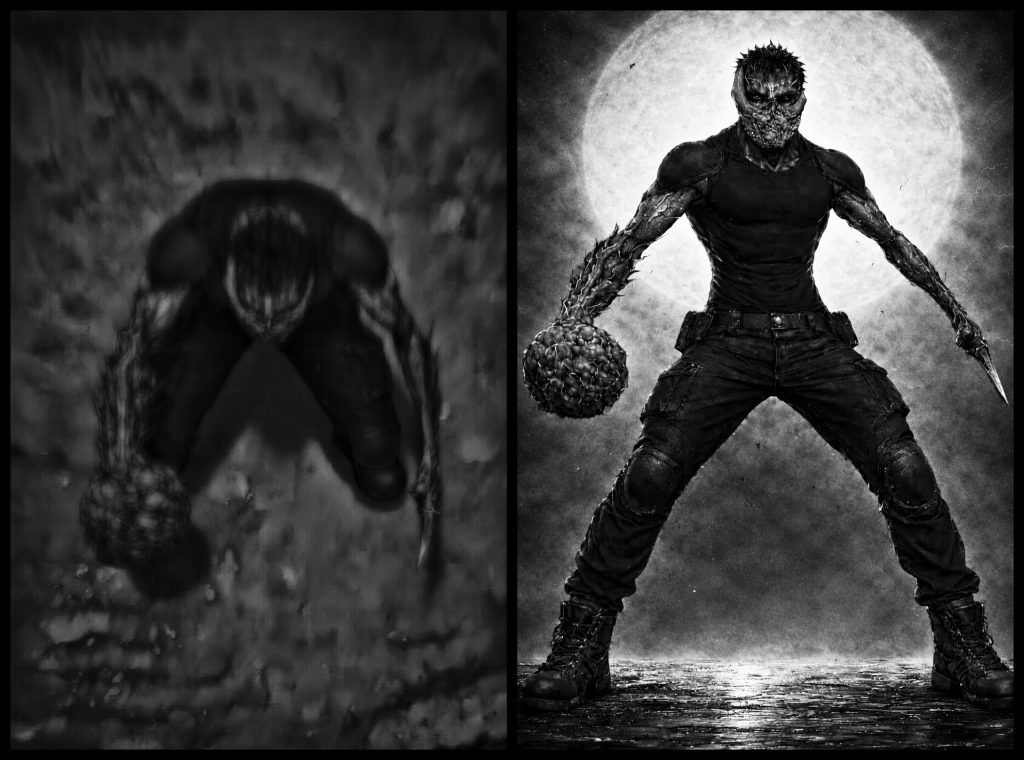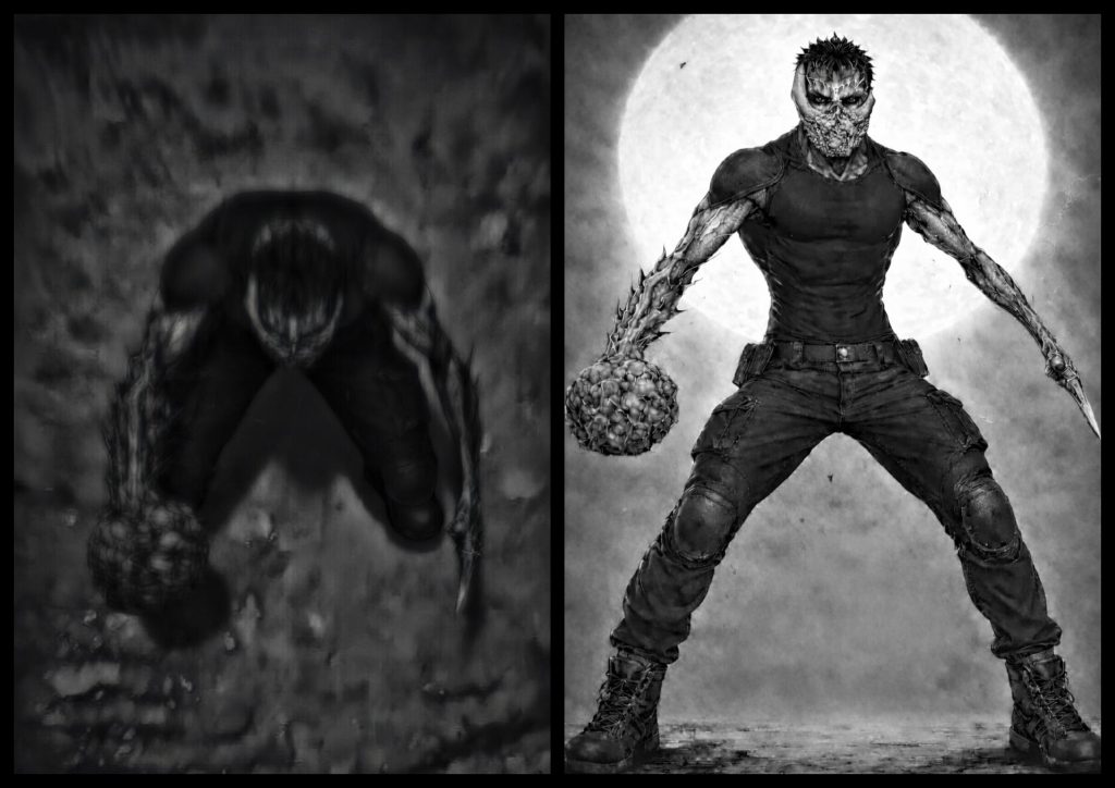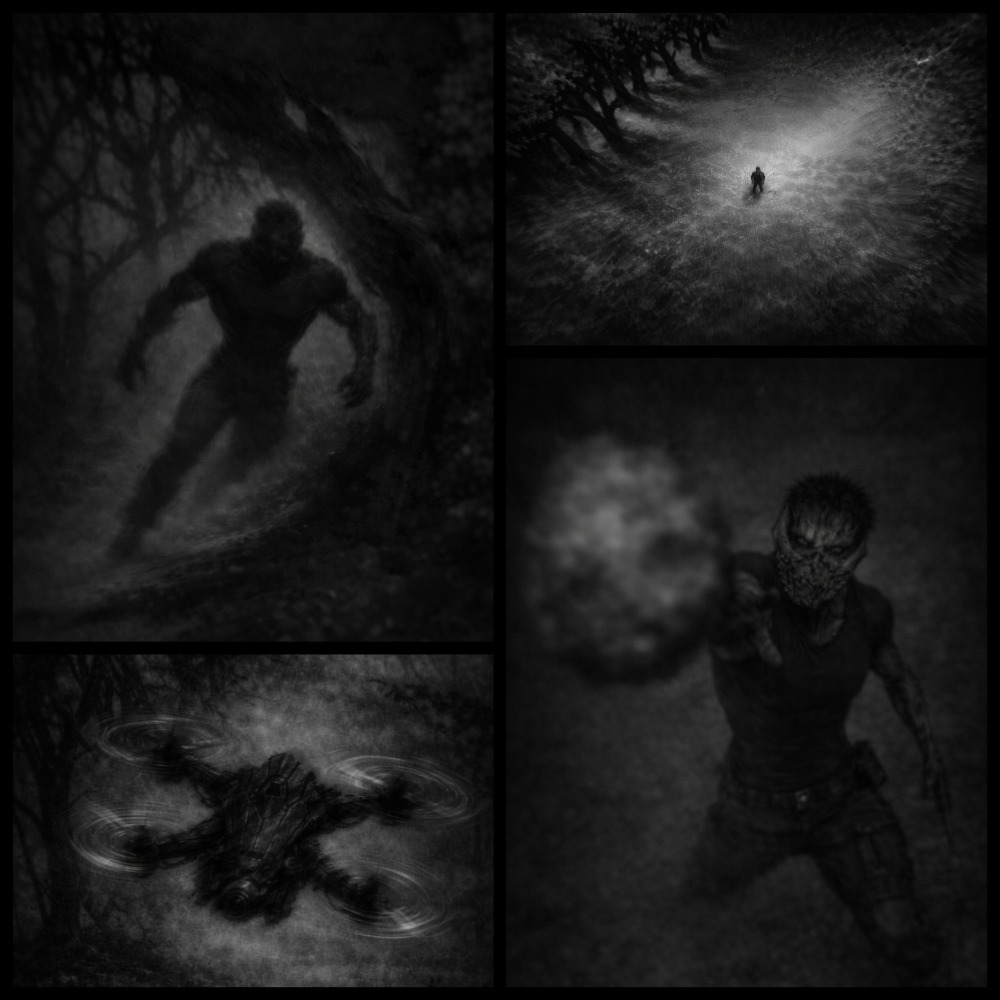 Gunshots tear through the comms. The drone lifts again, the view pulling up and back. From above, the figure drops to all fours as its arms begin to change – one thickening, swelling into a crude mace of fused bone and flesh, the other sharpening, stretching into a long, brutal stake.