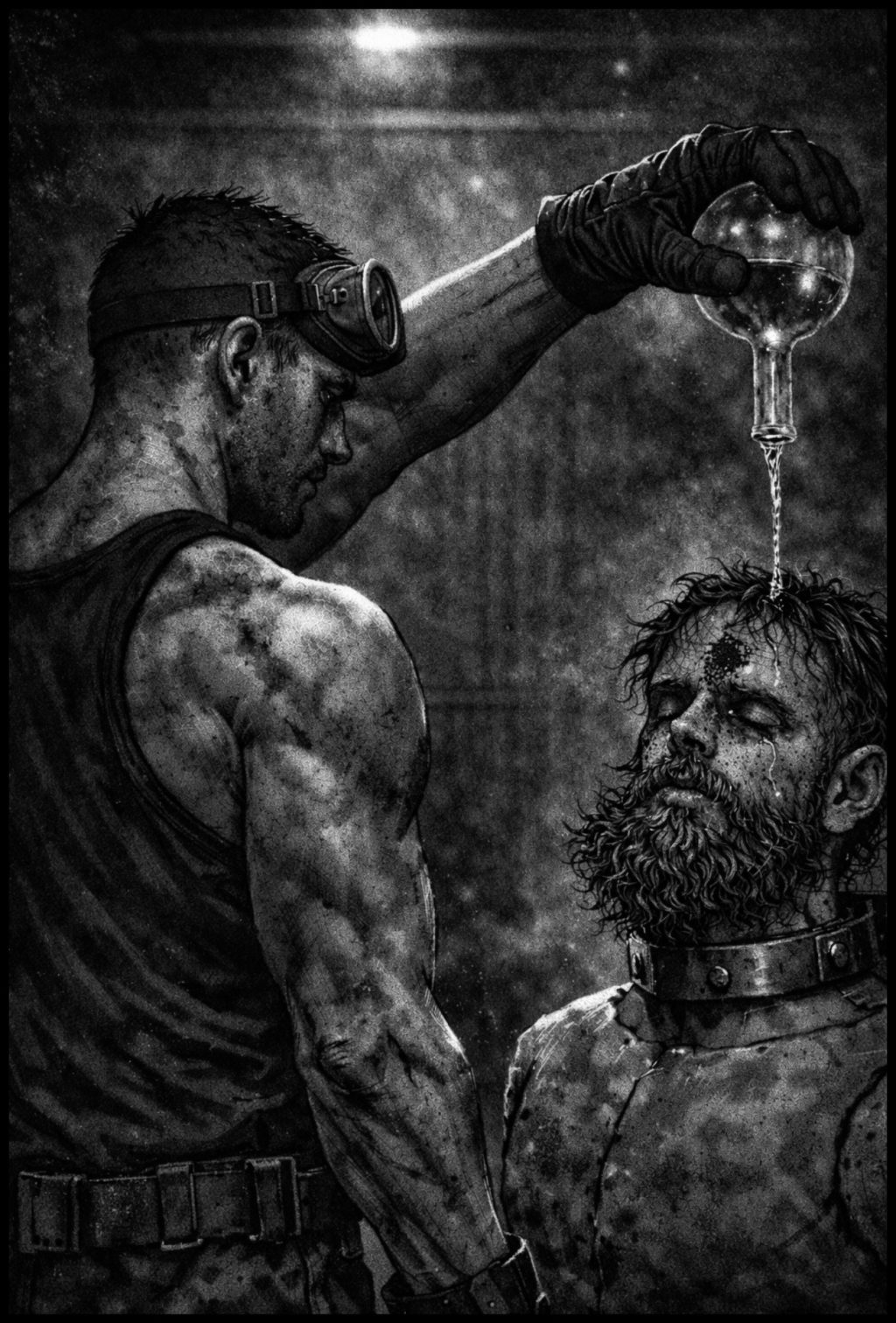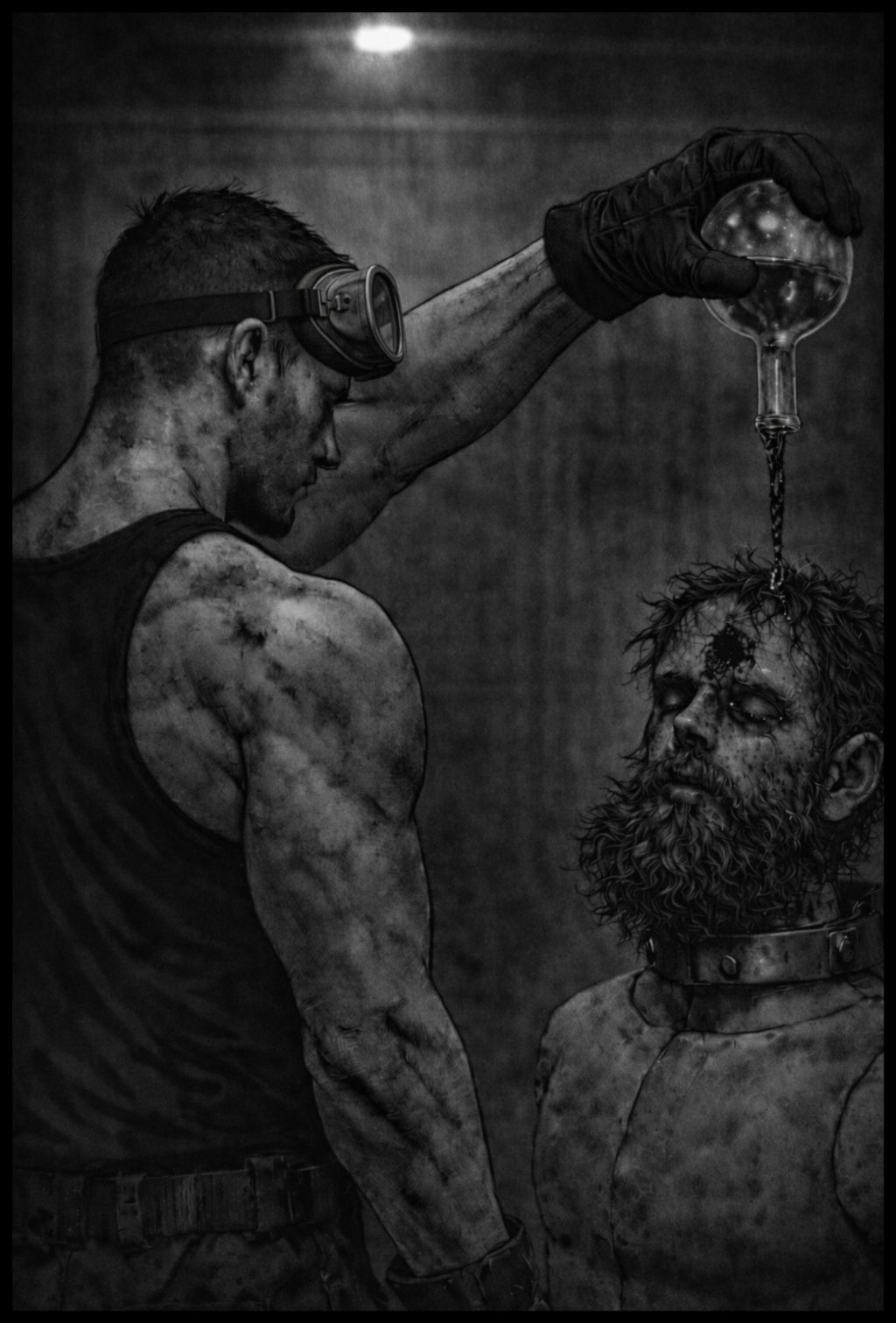 He raises the flask to eye level, watches the gel cling to the glass, resisting its own weight, then nods once and steps forward. Ten steps. The mannequin stands waiting. Where a plastic head should be, Vann’s head is fixed in place.
