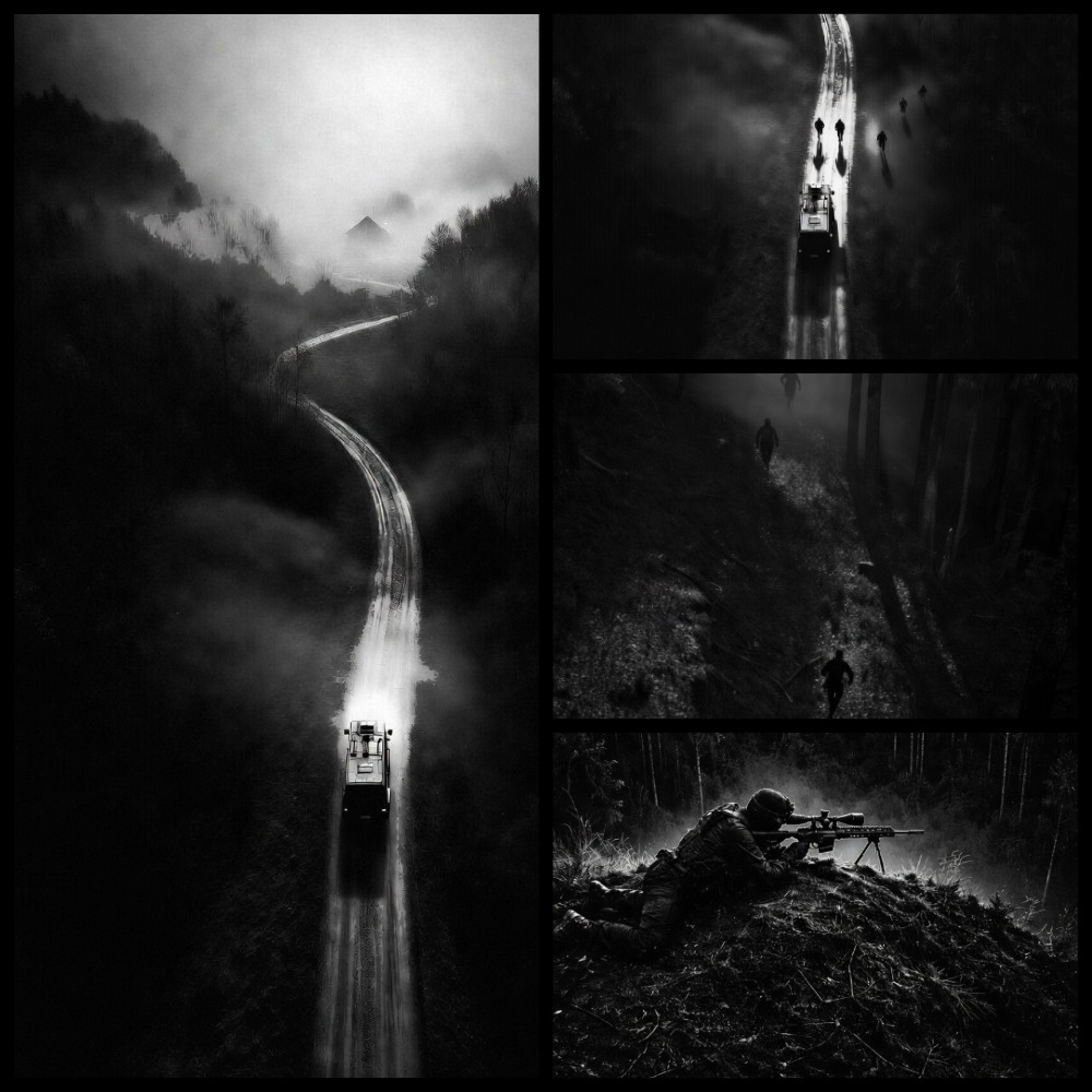 The van slows on the forest road and stops five hundred meters short of the lodge. The side door slides open and five soldiers pour out in a single, practiced motion, splitting instantly: three vanish into the trees, two stay on the road, low and controlled. As the teams break apart, another soldier steps down from the van and launches a compact drone, sending it up through the canopy.