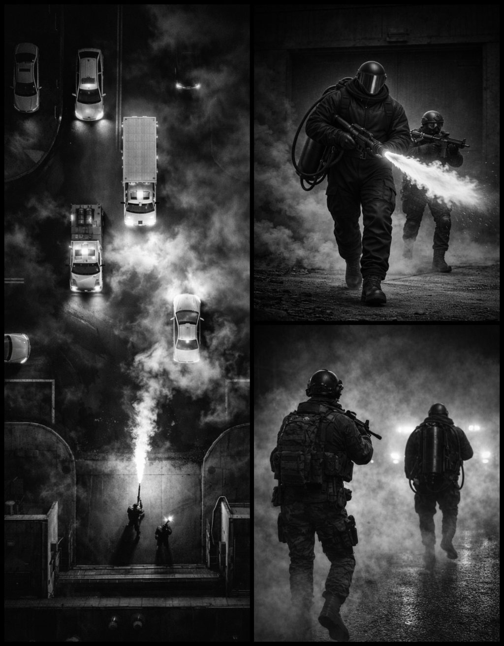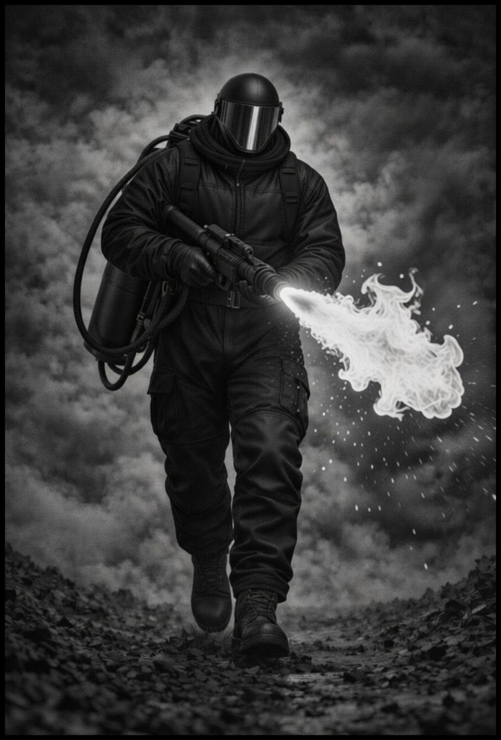 Cerberus braces the flamethrower against his shoulder, finger tightening on the trigger. The gates roll open and they burst through in formation, ready to flood the world in blue fire. Instead they are met with strobing lights and sirens that tear through the air. Fire engines block the front. Ambulances idle behind them. Red and blue reflections fracture across their masks. Ulrich and German are nowhere in sight. The lights blind them. The sirens hammer into their skulls, drowning out everything else.