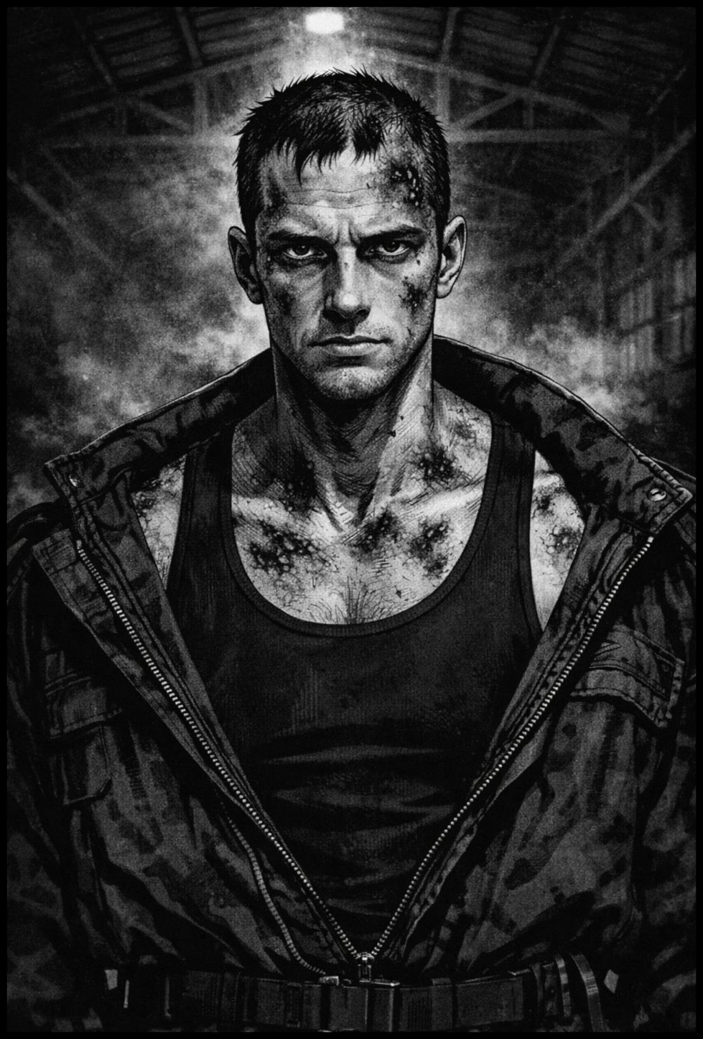 He launches at the first hacker like an attack dog, low and feral, teeth bared. His forearm hooks under the man’s chin, the other hand grips the shoulder harness, and he twists with his hips, ripping the spine free in a single violent wrench. Bone tears through flesh. The body collapses before it understands it is dead.