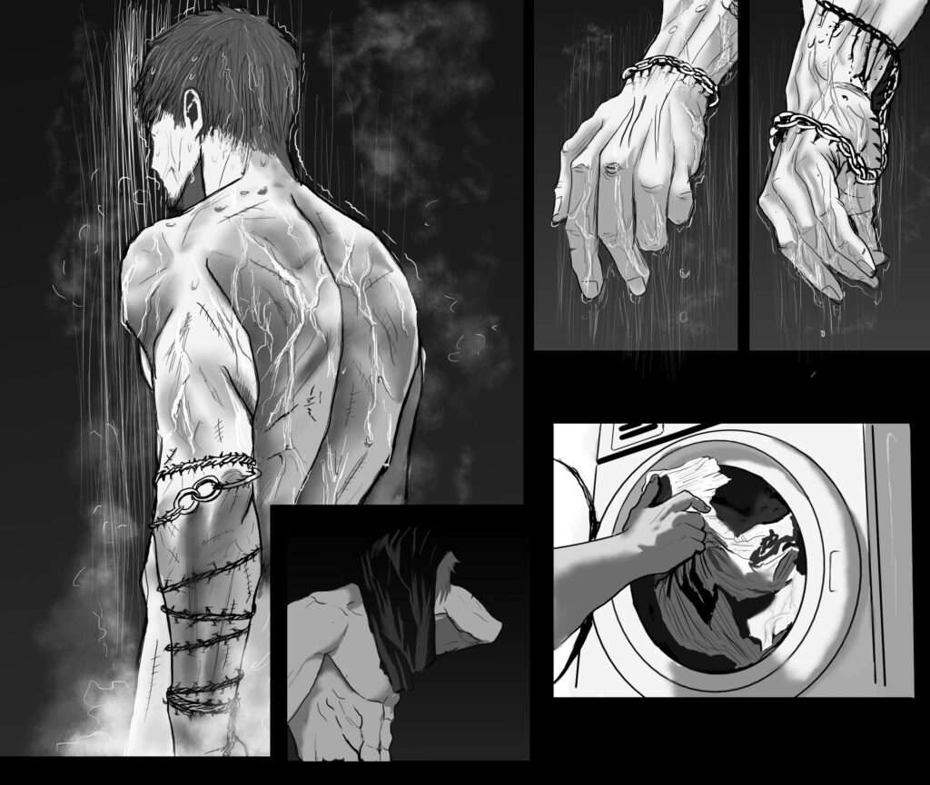 Covered in blood and milk, he staggered into the shower. Under the pounding stream of water, his battered body was slowly revealed – crisscrossed with old scars, each telling a silent story of pain and survival. Around his arm was wrapped a STRANGE DEVICE: a chain coiled tightly from wrist to elbow, smooth on the outside to spare clothing, but barbed inward with vicious spikes pressing into his skin.