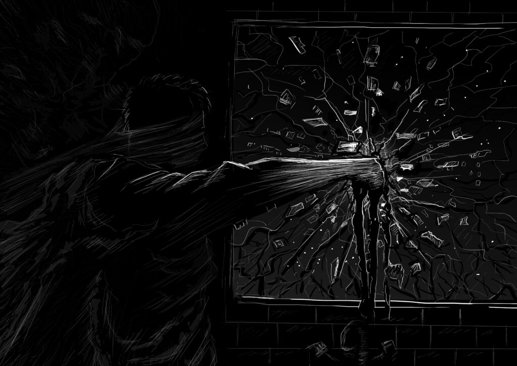 Drogo, fists clenched, stormed back inside. He headed for the restroom again, the essence whispering first into one ear, then the other, repeating: Weak… your fault… you are weak!… Drogo pressed his hands against his temples, grinding his teeth, trying to silence the voice. Entering the restroom, the whisper turned into a deafening shriek. He splashed cold water onto his face, rubbed his temples furiously, then raised his head and – with a roar – smashed his fist into the mirror.