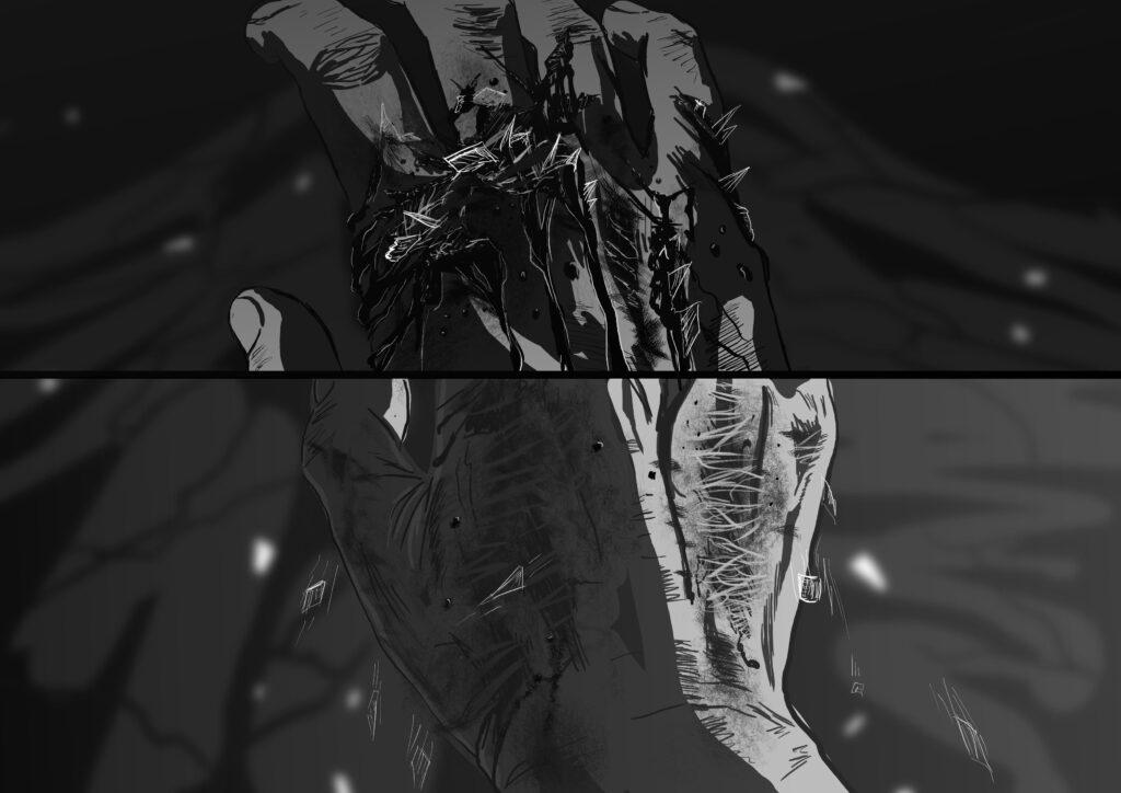 The pain flared instantly, but it brought a twisted kind of relief. Lowering his gaze, he focused on his injured hand. Several fingers were obviously broken – the knuckles shattered – but the blood quickly clotted, and the torn skin began to knit itself back together. The bones remained broken, but the flesh was already healing.