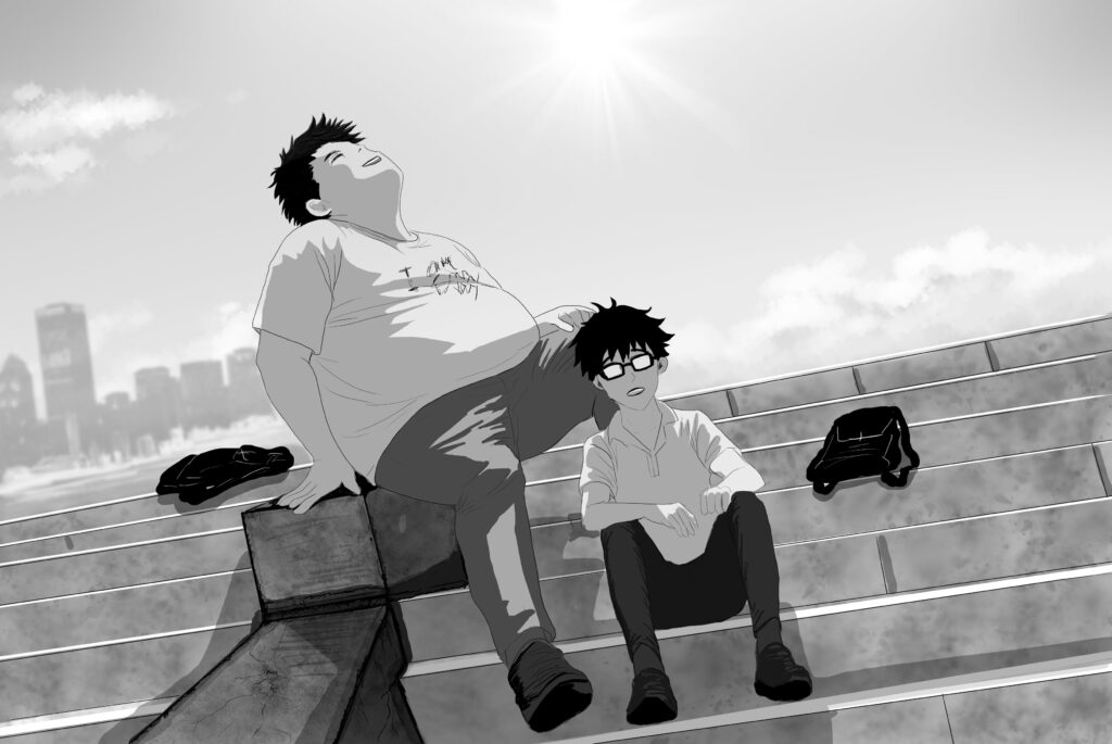 They sat on the steps leading down to the beach. The sun was already high in the sky. Gobby was devouring the pies with childlike glee, while German watched him with a quiet, delighted fascination. Wanting to break the silence, German asked something simple: