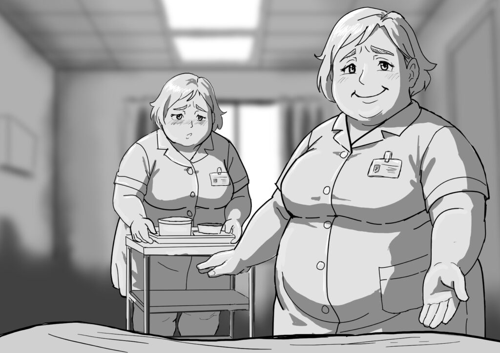 The one near the food cart – Nurse #1 – is a walking mess. Her hands are constantly fumbling – forks clatter, napkins fall, trays rattle. Her movements are nervous, fast, and chaotic, like she’s always ten steps behind the moment.