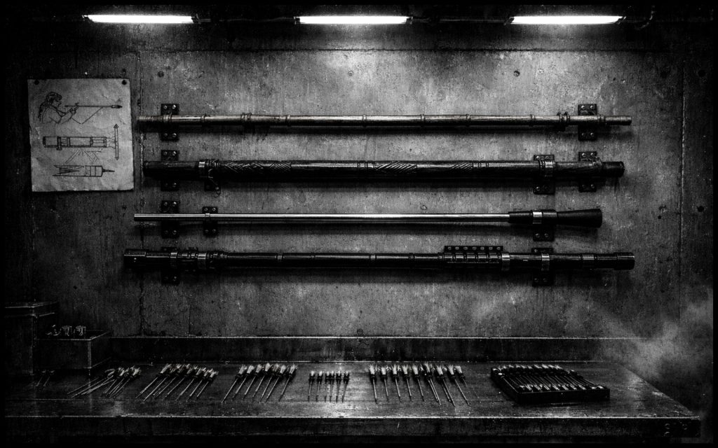 German turns out to be right. The first room is an armory, but it holds only two types of weapons – cold steel and blowguns. On the left side the entire wall is covered with sharp objects: mostly different kinds of knives, but also razor blades and even awls. On the right side many blowguns hang on the wall, from classic models to modern ones. Beneath them stands a cabinet with shelves filled with different types of darts.